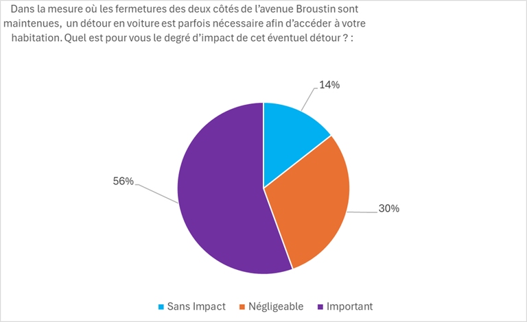 En effet, 68,5 % des riverains de la zone d’enquête ont indiqué être défavorables au projet dans sa globalité et 63,7 % des répondants sont opposés à la fermeture de l’avenue Broustin.